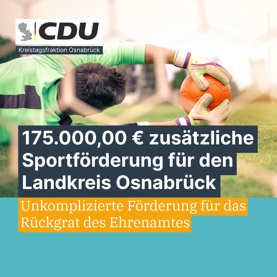 Als CDU-Kreistagsfraktion Osnabrück setzen wir uns dafür ein, dass auch im Haushalt 2025 erneut 250.000 Euro für die Sportförderung bereitgestellt werden und die Unterstützung des Kreissportbundes fortgeführt wird. Mit diesen Fördermitteln soll die wichtige Arbeit der Sportvereine und ehrenamtlichen Helfer weiterhin gestärkt werden.