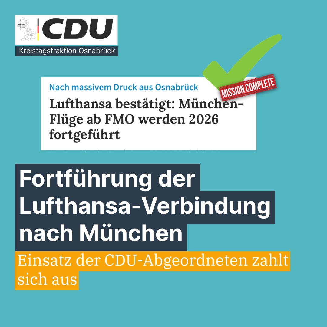 Die CDU-Kreistagsfraktion Osnabrück begrüßt die Entscheidung der Lufthansa, die wichtige Verbindung vom Flughafen Münster/Osnabrück (FMO) nach München auch 2026 fortzuführen. Ein starkes Signal für Osnabrück und den gesamten Nordwesten.