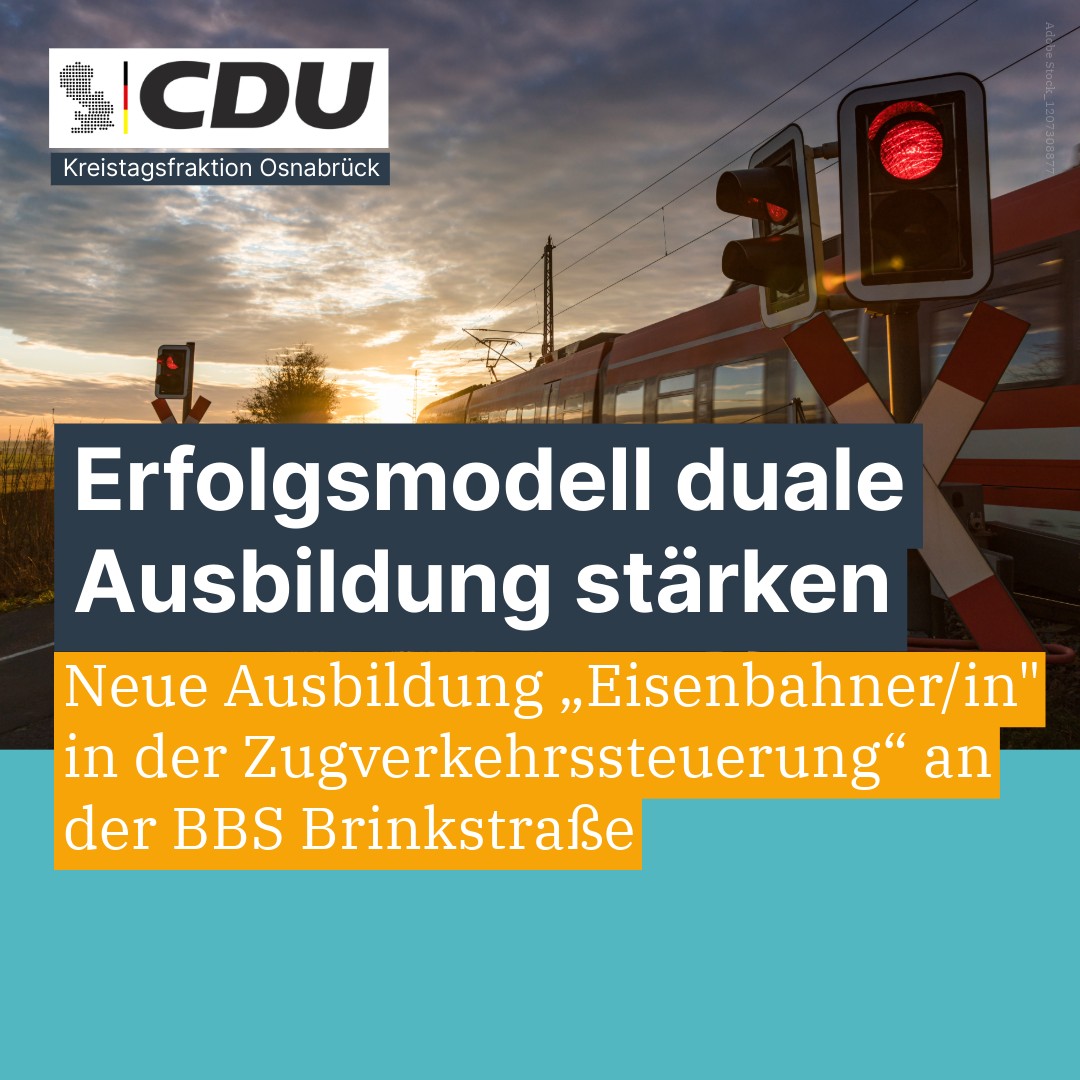 Die CDU-Kreistagsfraktion Osnabrück unterstützt ausdrücklich die Pläne der DB InfraGO AG, ab dem Schuljahr 2027/2028 die duale Ausbildung zum/zur „Eisenbahner/in in der Zugverkehrssteuerung“ auch in Osnabrück anzubieten und den entsprechenden Bildungsgang an den Berufsbildenden Schulen des Landkreises Osnabrück einzurichten.