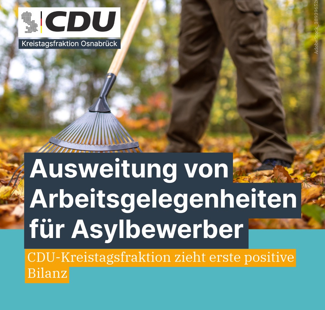 Als CDU-Kreistagsfraktion Osnabrück befürworten wir ausdrücklich die konsequente Umsetzung und Weiterentwicklung von Arbeitsgelegenheiten für Asylbewerber im Landkreis Osnabrück. Ein entsprechender Auftrag an die Kreisverwaltung, der auf unseren Antrag hin bereits im Februar im Ausschuss für Soziales, Senioren und Gleichstellung beschlossen wurde, zeigt bereits erste positive Wirkungen.